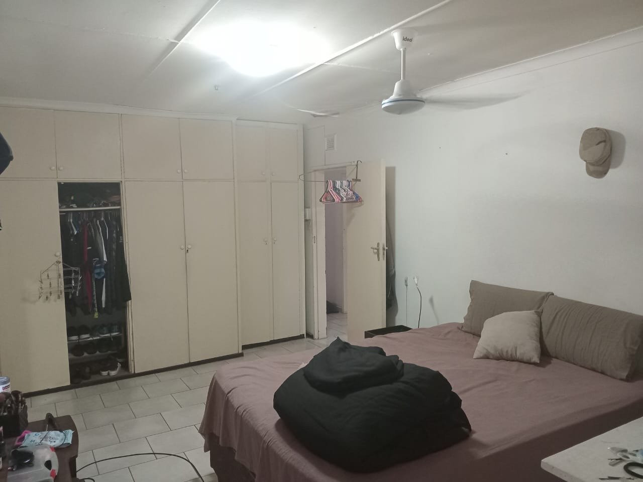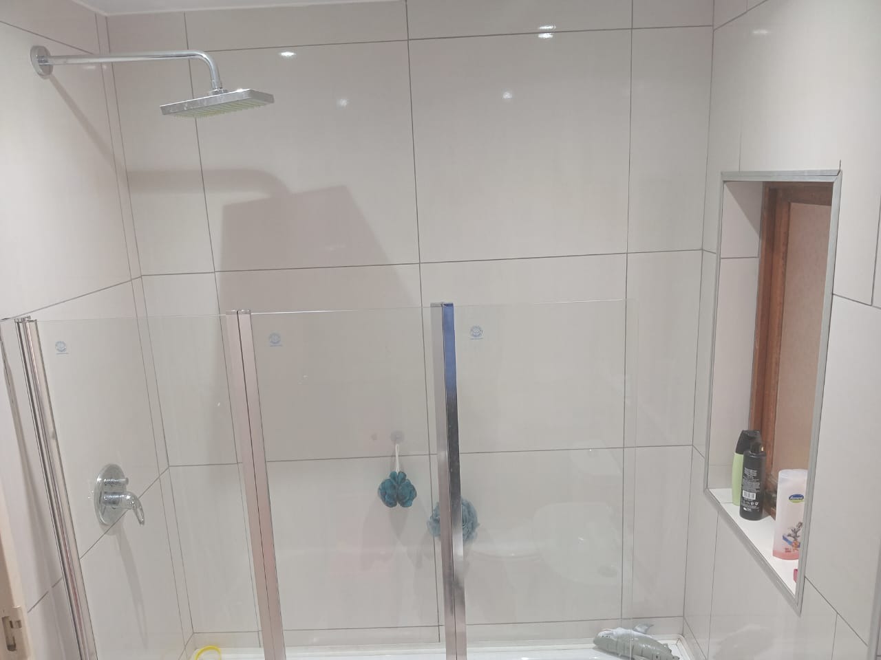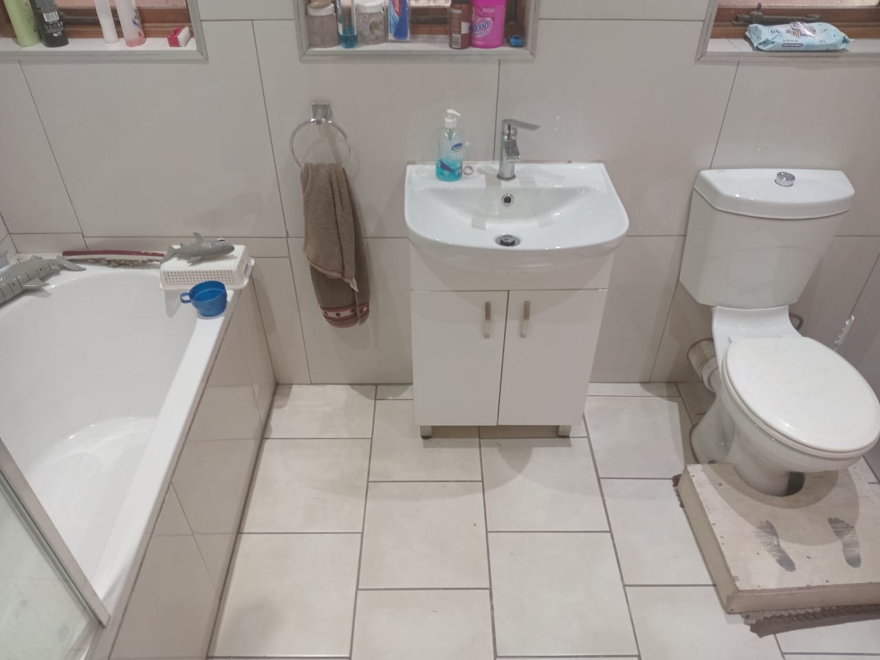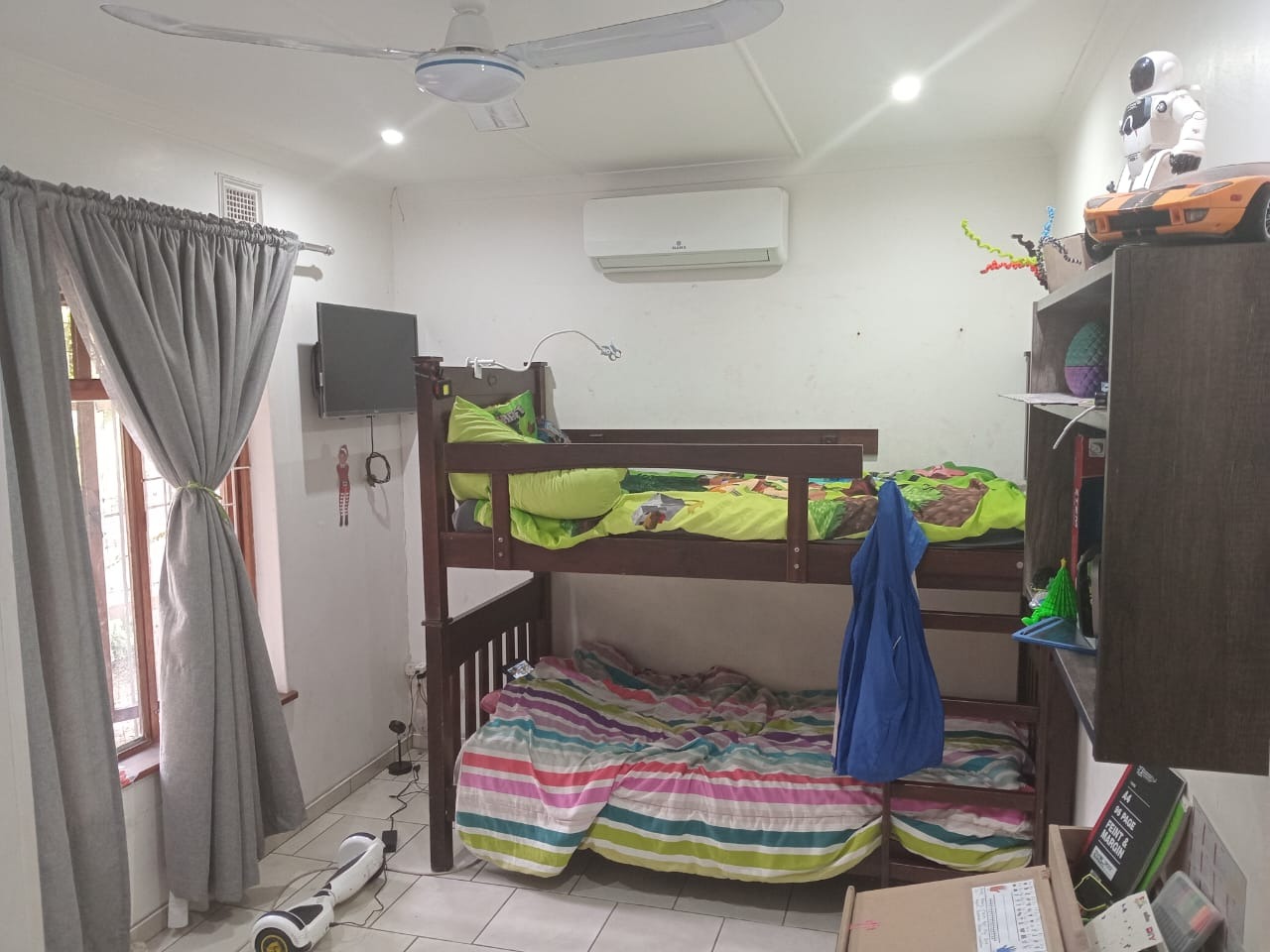The home features three well-proportioned bedrooms, each designed for comfort. One bedroom offers extensive built-in wardrobes, ensuring ample storage, along with a ceiling fan for climate control. Another bedroom, ideal for children, includes a ceiling fan and air conditioning. The two bathrooms cater to family needs; one presents a modern aesthetic with large, light-colored tiles, a shower-over-bath setup with a rain shower head, and a recessed shelf. The second bathroom features modern white fixtures including a bathtub, vanity, and toilet, with practical recessed shelving.