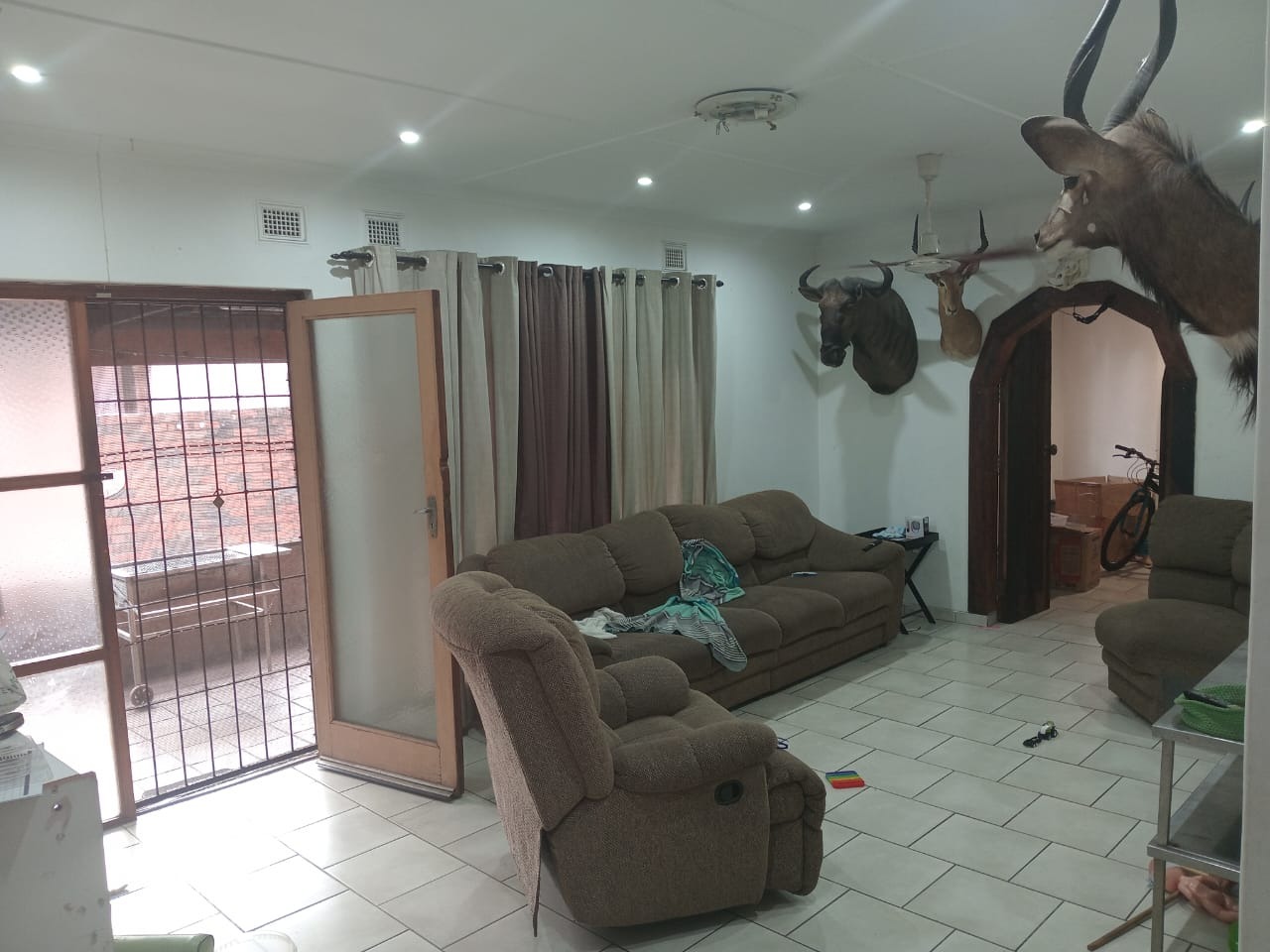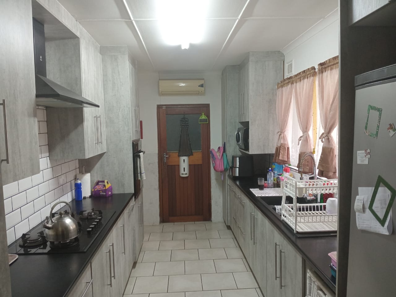 Step inside to a spacious living area, complete with durable tiled floors and recessed lighting, offering a comfortable space for relaxation and entertaining. An arched doorway leads to other parts of the home, while a security gate provides access to an outdoor area, perfect for enjoying the South African climate and a visible BBQ. The modern galley kitchen is a highlight, boasting sleek grey cabinetry, black countertops, and a white subway tile backsplash. It is well-equipped with a built-in hob, extractor fan, oven, and microwave, complemented by an air conditioning unit for comfort.