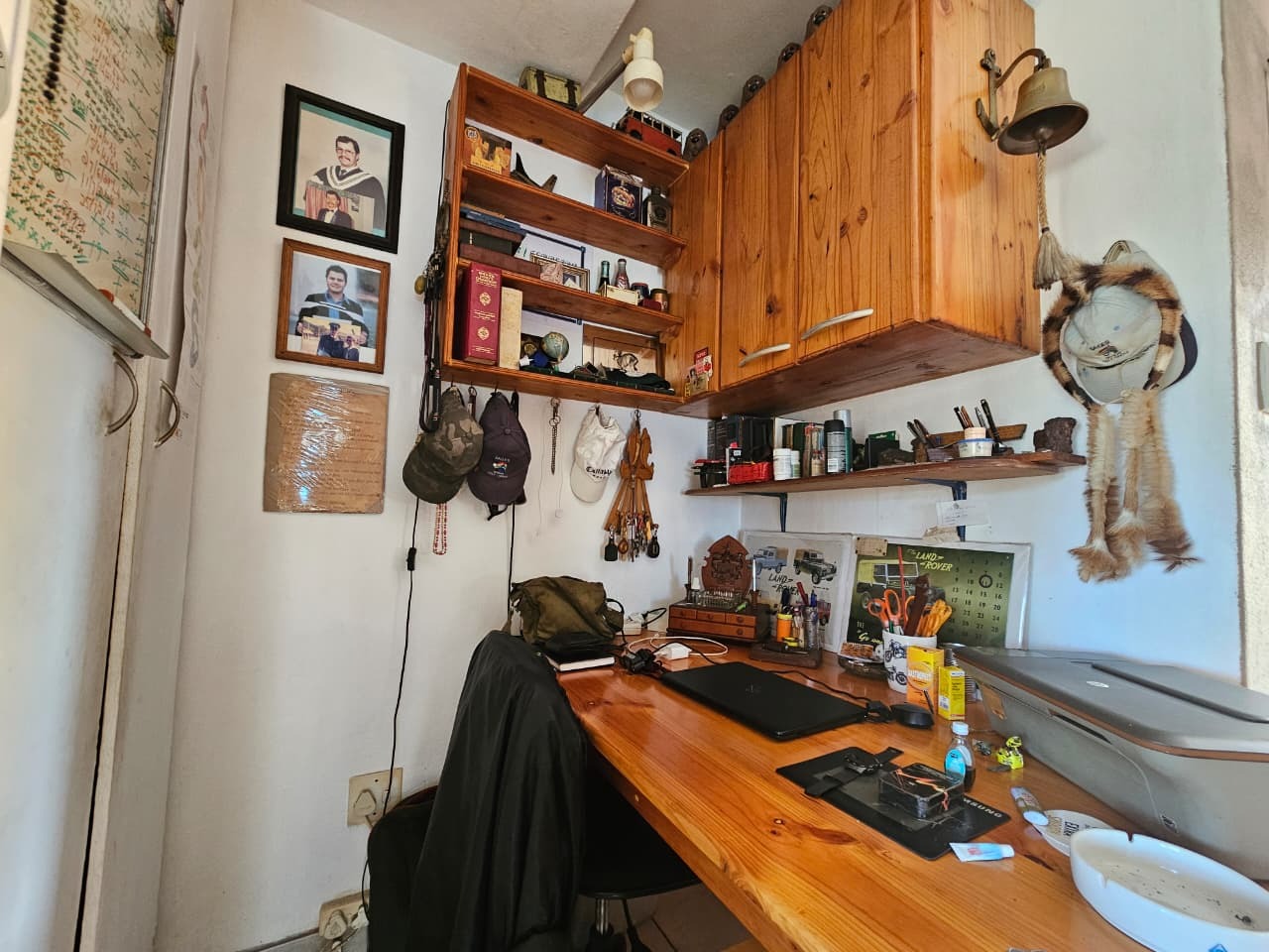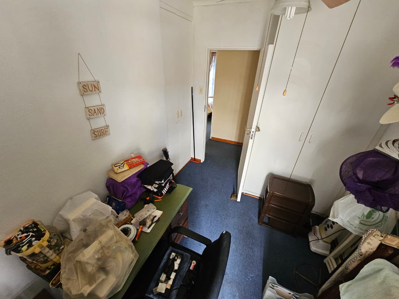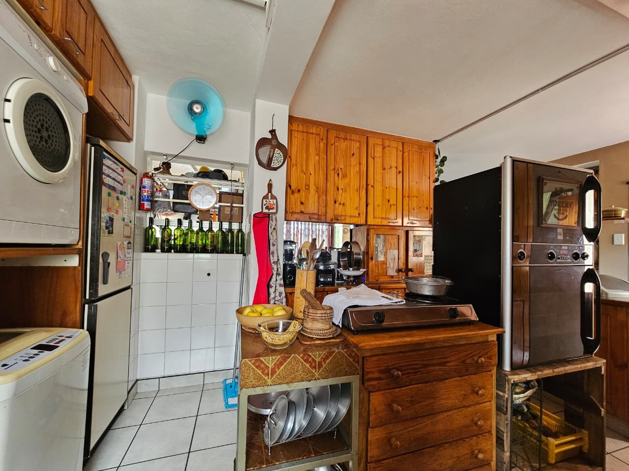 The living area features a tiled lounge equipped with a fan, lights, and blinds—perfect for relaxed everyday living. The kitchen, while older in style, is neat and functional with Formica countertops, an electric stove, and an undercounter oven, catering to all your cooking needs.