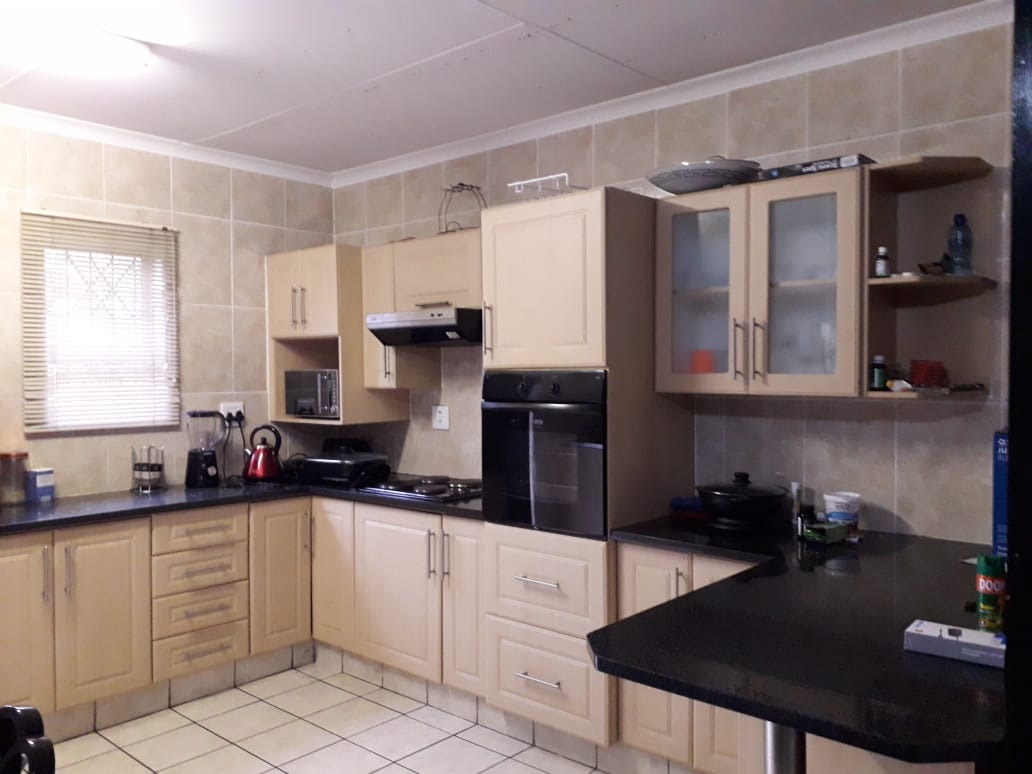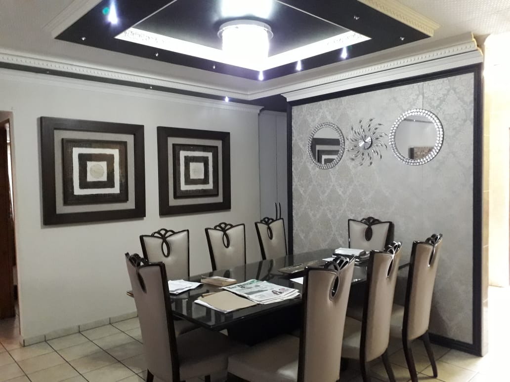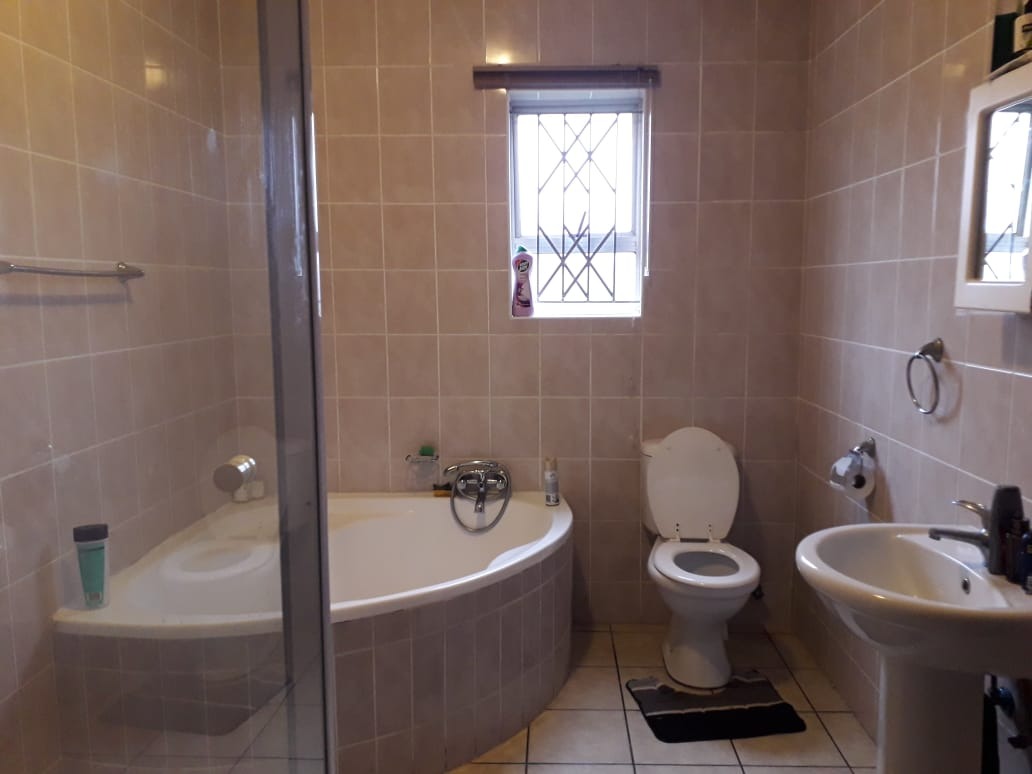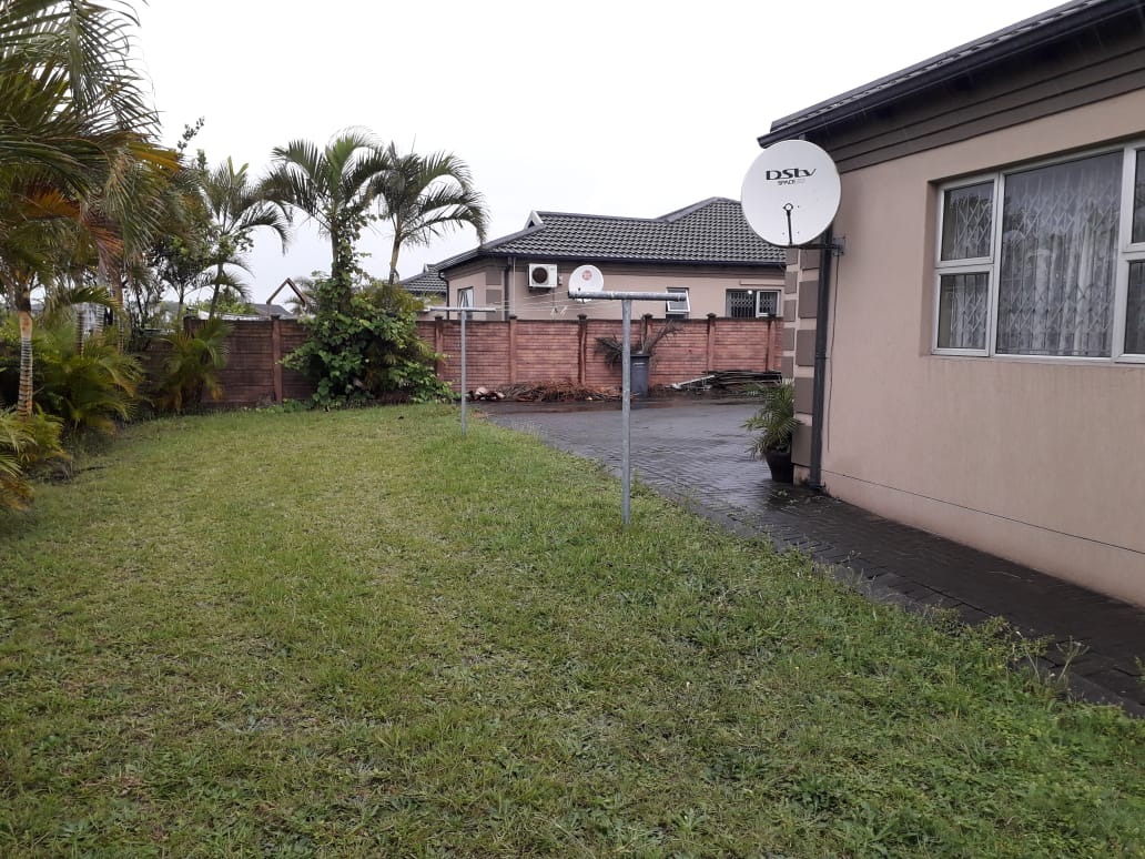 This inviting 3-bedroom, 2-bathroom rental property in Richards Bay offers comfortable and modern living spaces ideal for families. The spacious lounge features contemporary decor, a striking stone accent wall, and dark leather seating, complemented by decorative ceiling lighting and natural light from windows fitted with security bars. The stylish dining room, perfect for entertaining, showcases a black dining table for eight, a prominent feature wall with patterned wallpaper, and elegant tiled flooring. The well-appointed kitchen is designed for functionality, equipped with modern light-colored built-in cabinetry, dark countertops, an integrated oven, hob, and extractor fan. A convenient breakfast bar adds to its appeal, with tiled walls and floors ensuring easy maintenance. The three comfortable bedrooms provide ample private space. The two fully tiled bathrooms include one with a corner bathtub and integrated shower screen, and another with a wall-mounted sink and toilet, both featuring natural light and security bars on windows. Outside, the property features a private garden with a grassy yard, mature palm trees, and lush greenery, enclosed by a boundary wall and fencing, offering a serene outdoor retreat. Two garages provide secure parking. The presence of security bars on windows throughout the home, along with perimeter fencing, contributes to a secure living environment. Located in the established suburb of Arboretum, Richards Bay, South Africa, this home offers a convenient base for residents. Key Features: * 3 Bedrooms * 2 Bathrooms * 2 Garages * Modern Kitchen with Breakfast Bar * Stylish Dining Room * Spacious Living Area * Private Garden * Security Bars on Windows * Satellite Dish