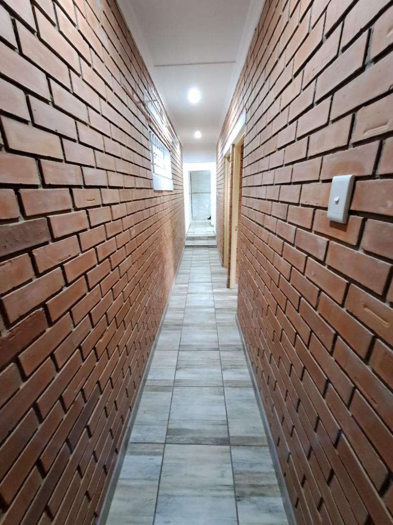 The three bedrooms are designed for comfort and practicality, each featuring durable tiled flooring and built-in wardrobes for ample storage. Unique exposed brick accent walls add character and a contemporary touch to several rooms, including the bedrooms and a narrow hallway. The single bathroom is clean and functional, catering to the needs of the household.