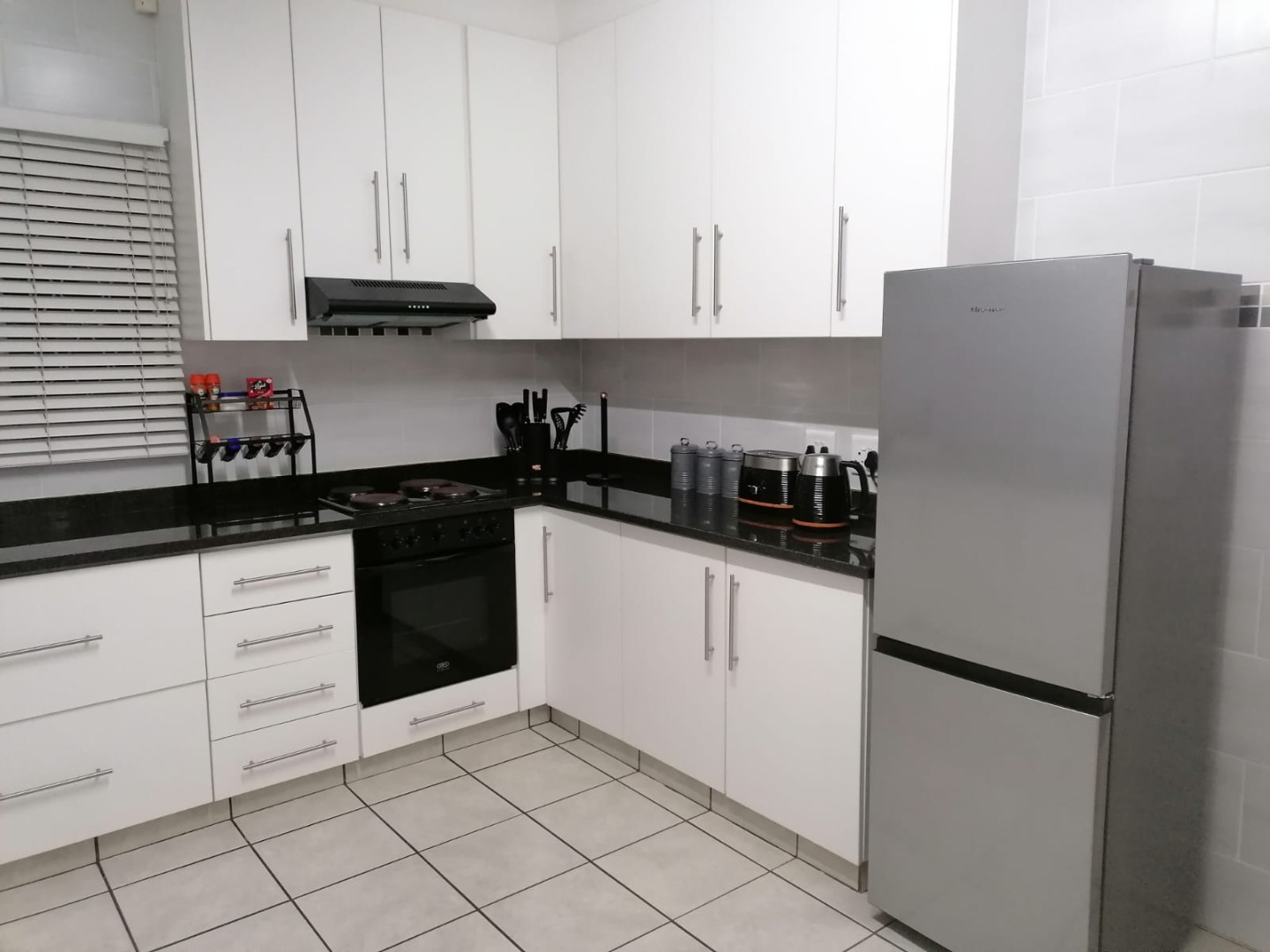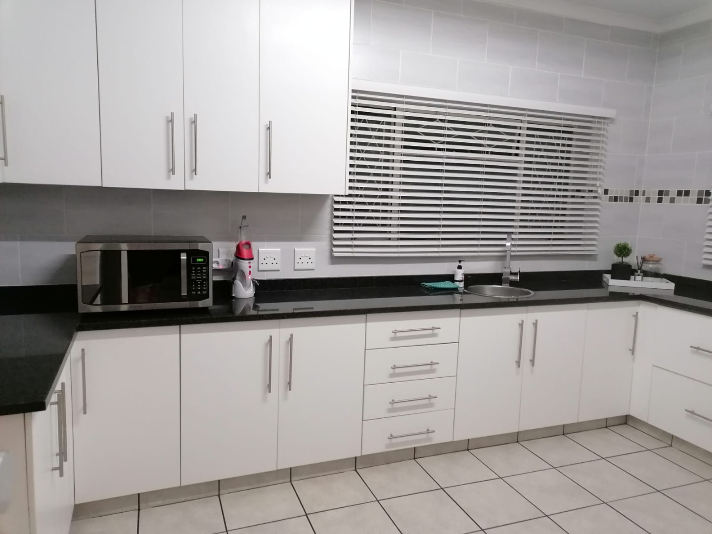 This inviting 3-bedroom, 2-bathroom home in Meer En See, Richards Bay, offers comfortable living with desirable features. The interior boasts a spacious lounge, a dedicated dining room, and an additional family TV room, all featuring durable tiled flooring and air conditioning for year-round comfort. The modern kitchen is a highlight, equipped with sleek white cabinetry, black granite countertops, an integrated oven, hob, and extractor fan. A separate scullery provides a double sink, space for a dishwasher and washing machine, ensuring practicality and ample storage.