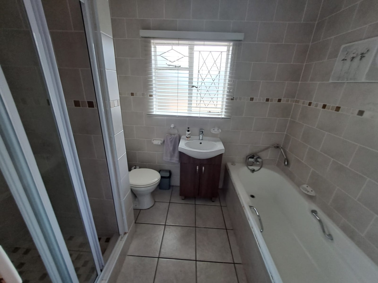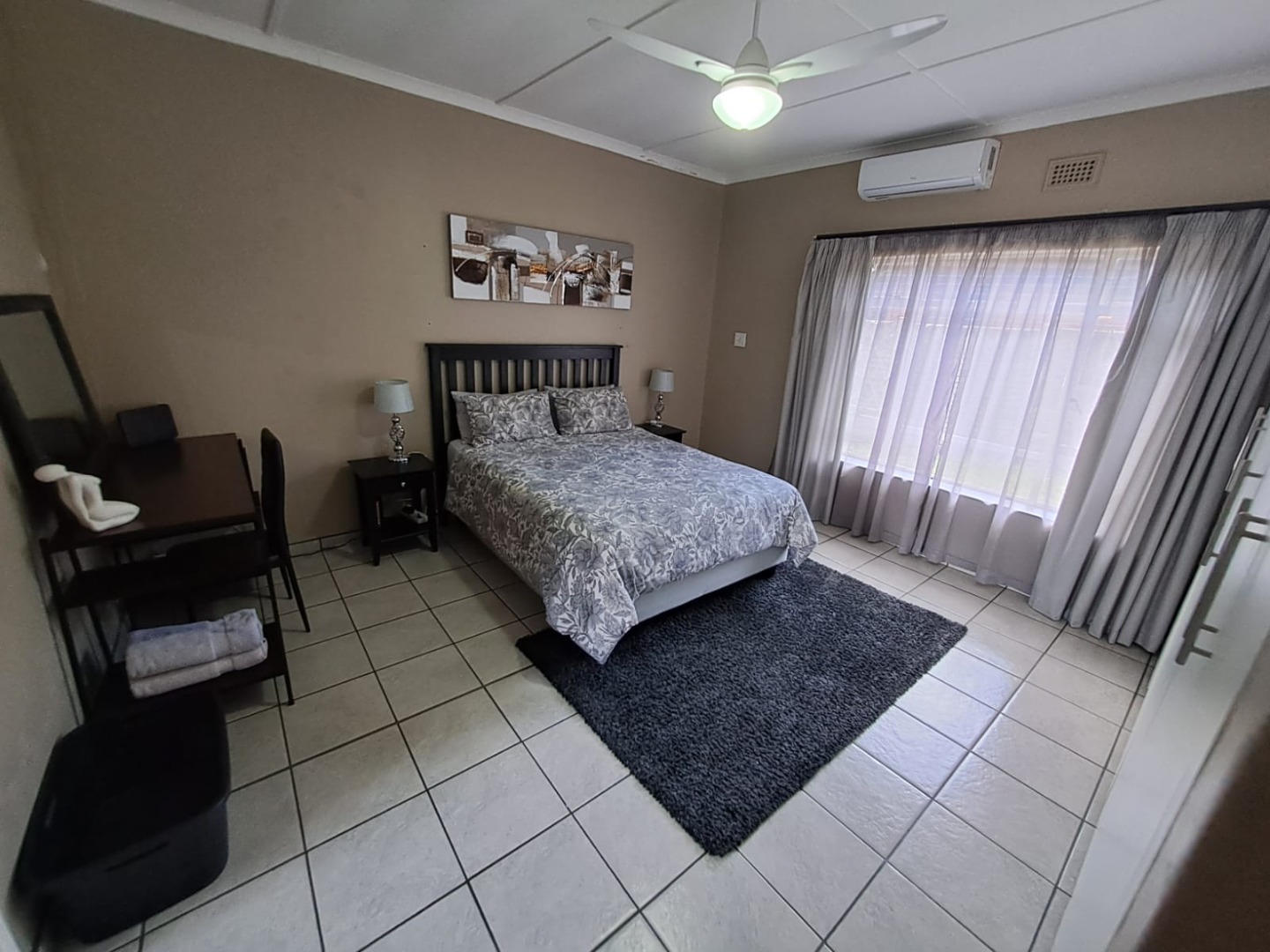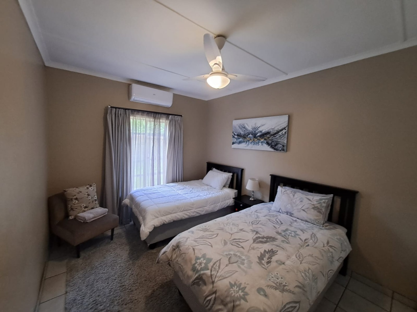 The three well-appointed bedrooms provide private retreats. One bedroom includes air conditioning, a ceiling fan, and a dedicated desk/dressing area. The two fully tiled bathrooms are functional; one features a separate shower and a bathtub, while the other includes a full-sized bathtub, both fitted with modern vanities. Please note, pets are not permitted at this property.
