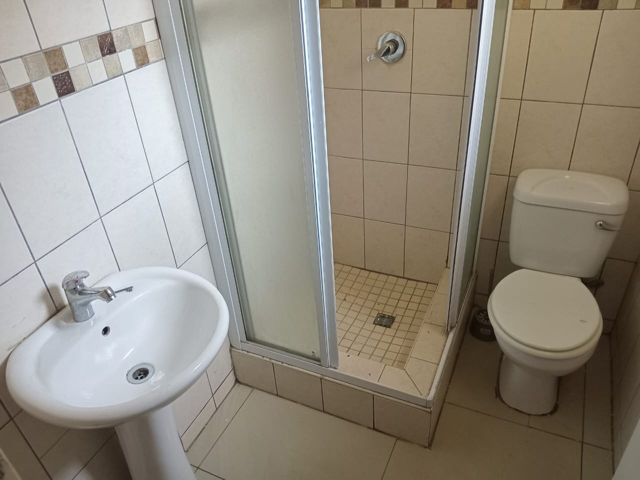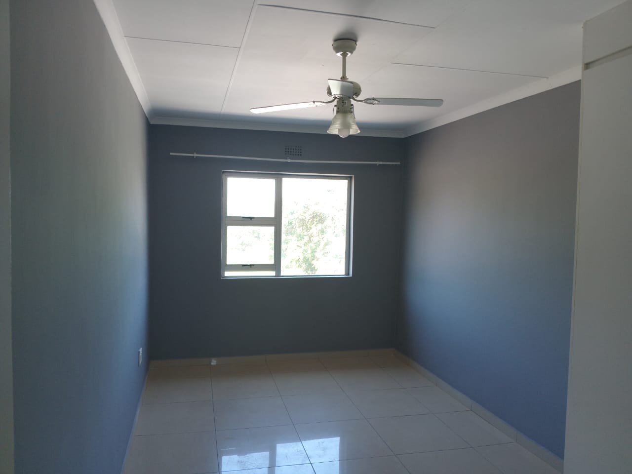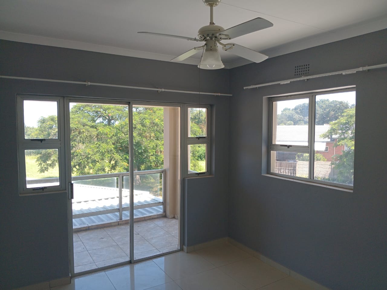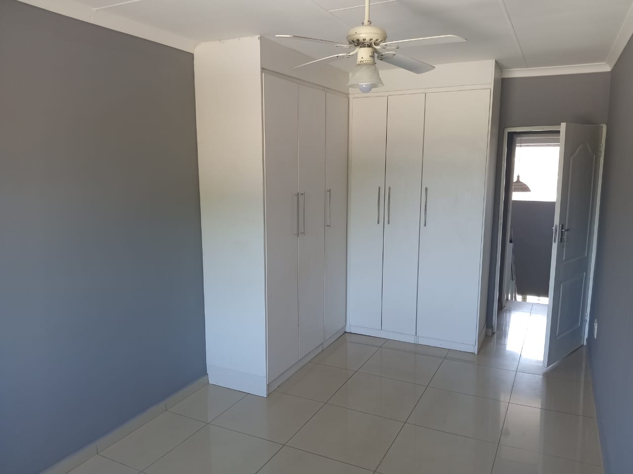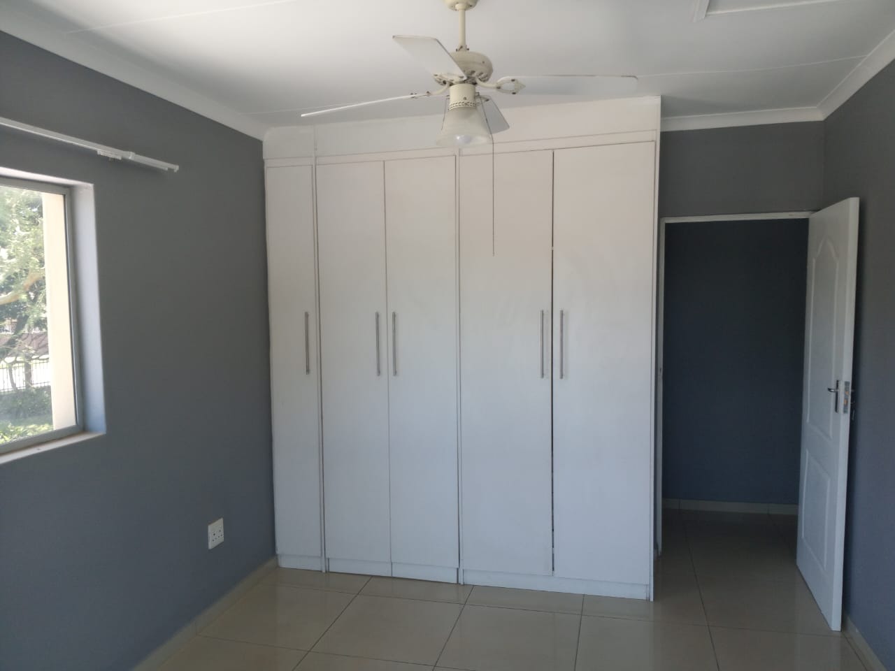 Each of the three unfurnished bedrooms is designed for comfort and practicality, featuring clean tiled flooring, freshly painted walls (some in dark grey, others lighter), and ample built-in wardrobes for extensive storage. Ceiling fans are installed in each room for climate control. The functional bathroom includes a pedestal sink, a glass-enclosed shower, and a toilet, fully tiled for convenience.