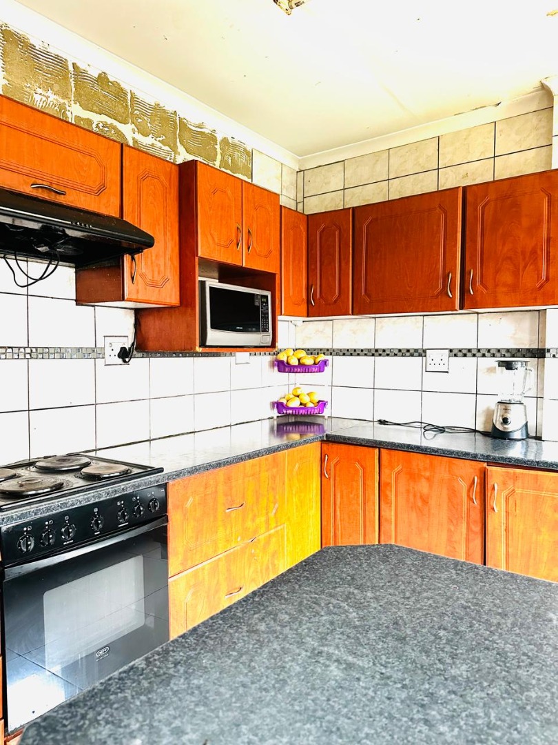 The property boasts an open-plan lounge and dining area, characterized by clean, tiled flooring and abundant natural light streaming through large windows, which are fitted with security bars for peace of mind. The functional kitchen is equipped with extensive wooden-look cabinetry, dark stone countertops, a built-in oven, and a stovetop, providing ample storage and preparation space. While offering a solid foundation, the kitchen and living spaces are ready for cosmetic updates to align with modern tastes.
