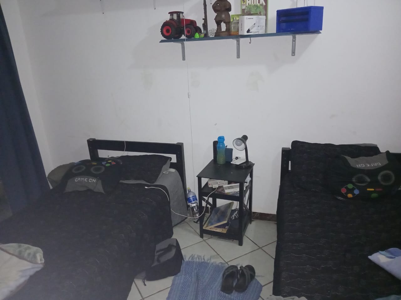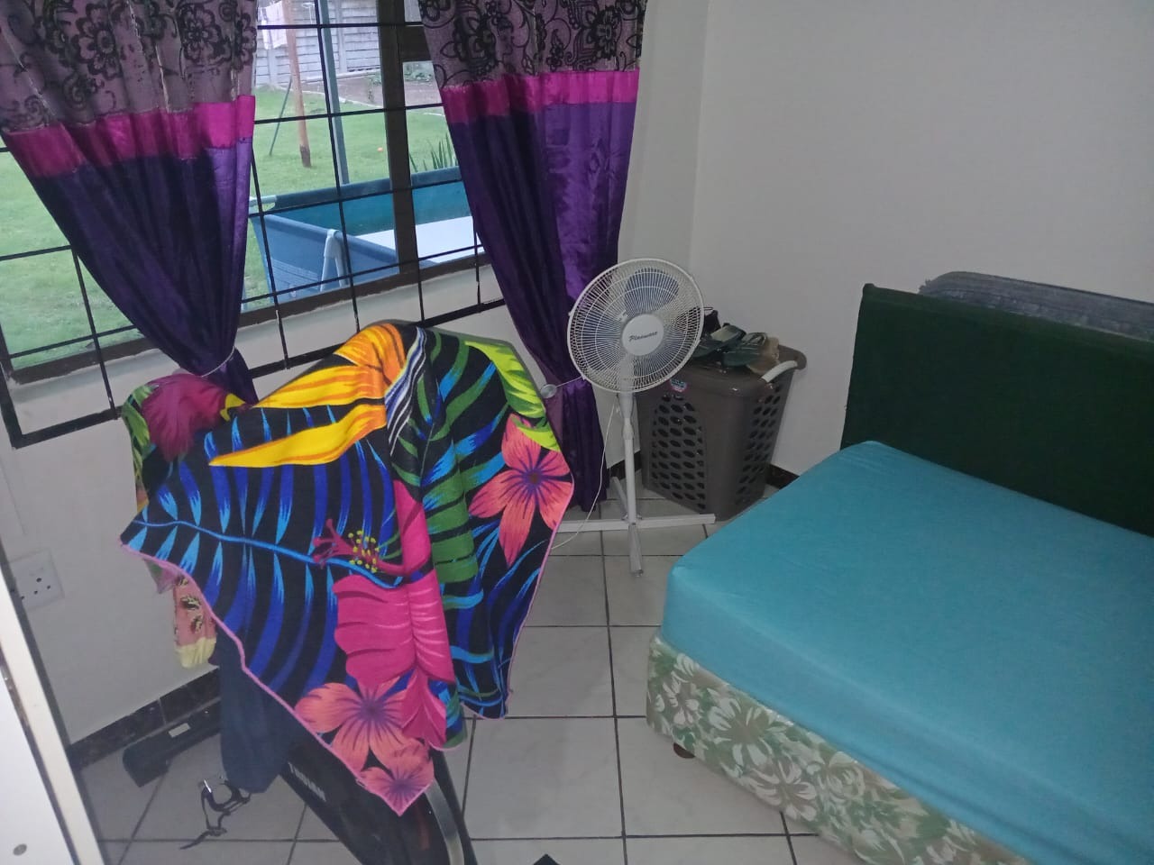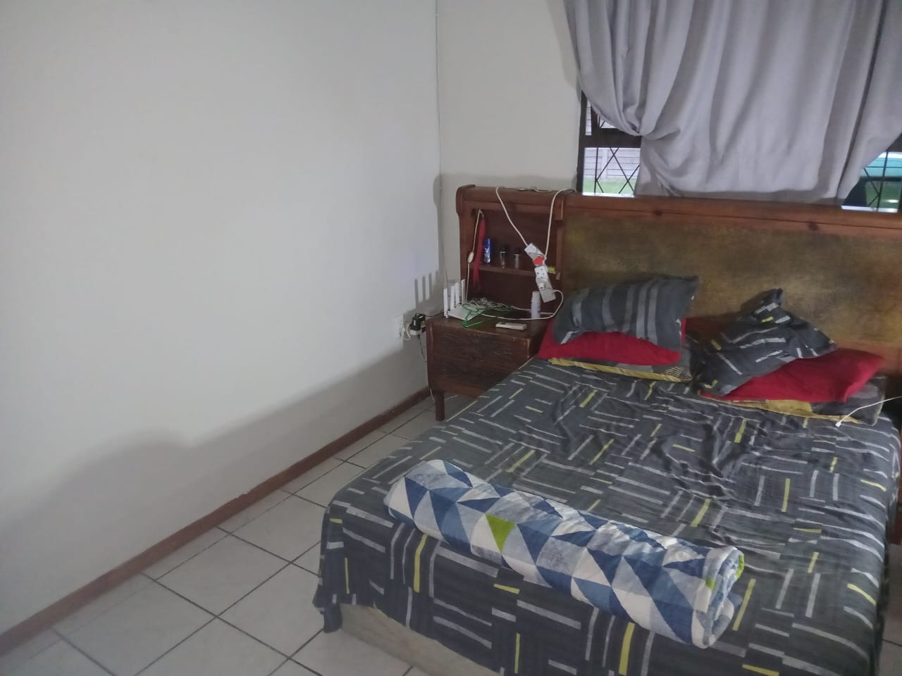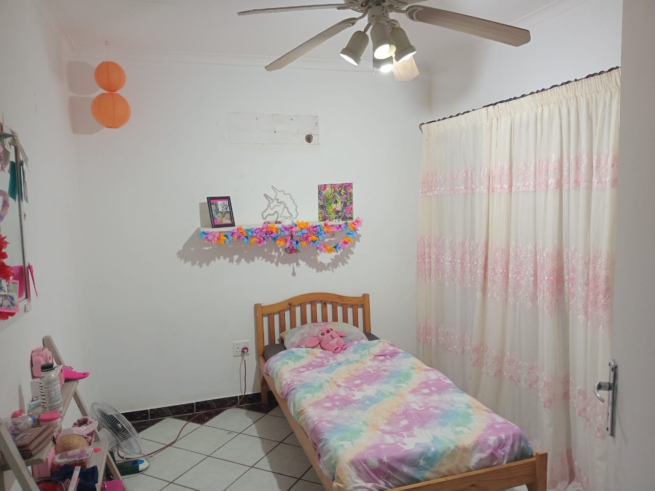 The main bedroom features an air conditioner, fan, lights, tiled floors, and curtain rails