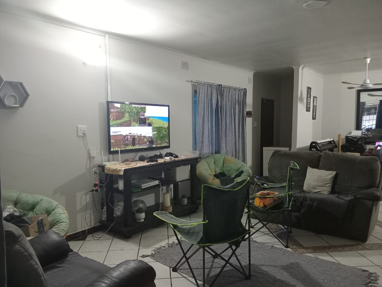 A comfortable tiled lounge with air conditioning, fan, lights, and curtain rails