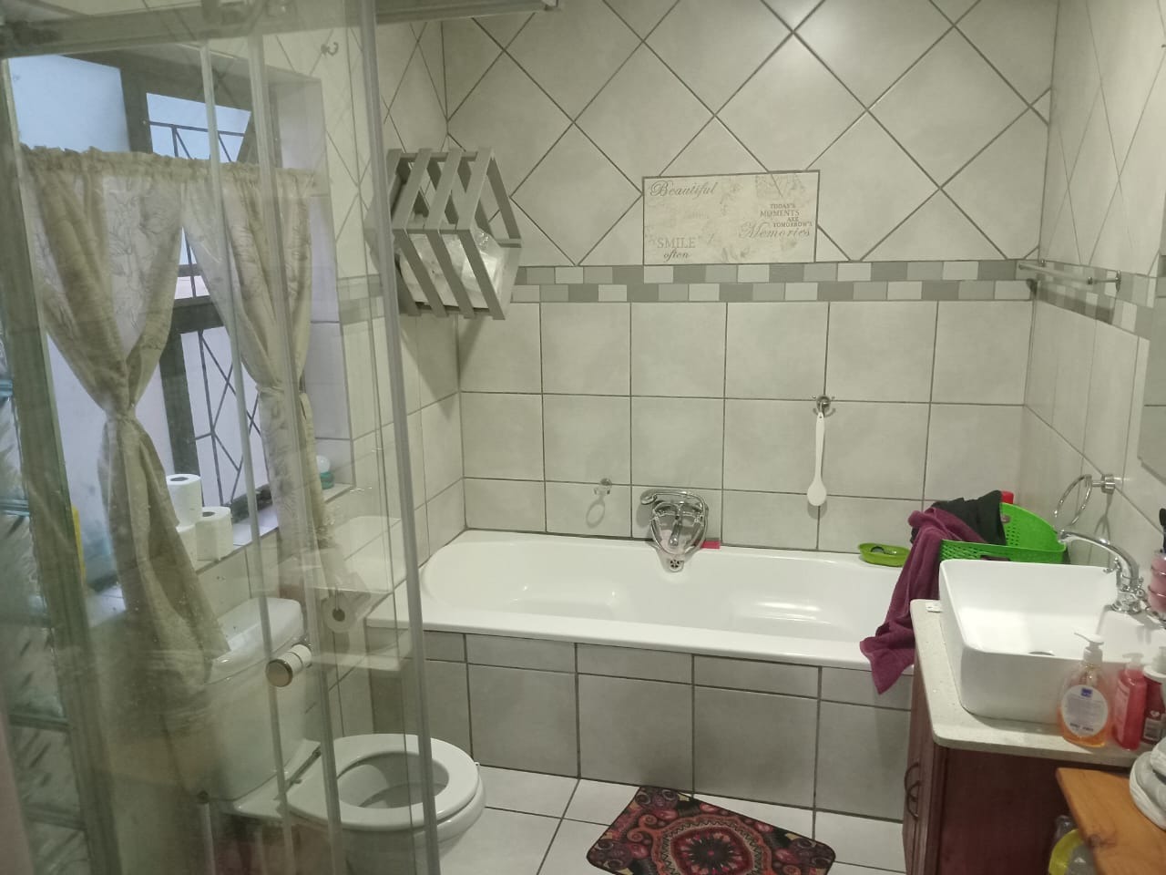 The main house features three well-sized bedrooms, all fitted with built-in cupboards, ceiling fans, lights, and curtain rails for added comfort. The main bedroom includes an en suite bathroom complete with a bath tub, shower, basin, and toilet. A separate full bathroom also includes a bath tub, shower, basin, and toilet, providing convenience for family and guests.