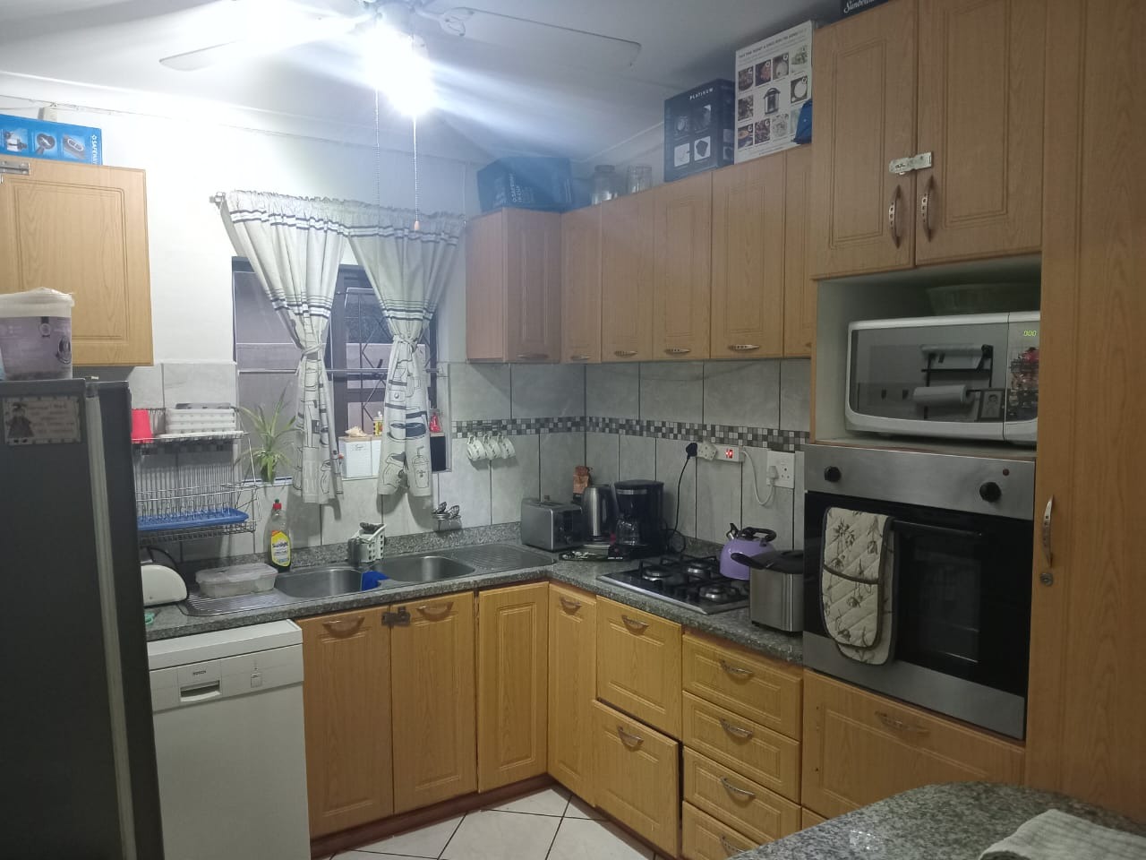 The living areas include a tiled lounge fitted with curtain rails and lighting, as well as a dining room with tiled floors, a ceiling fan, and light. The home offers an older-style kitchen with tiled flooring and Formica countertops, fitted with a gas hob and undercounter oven.