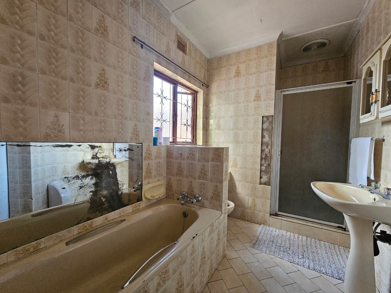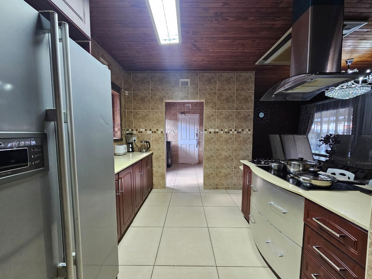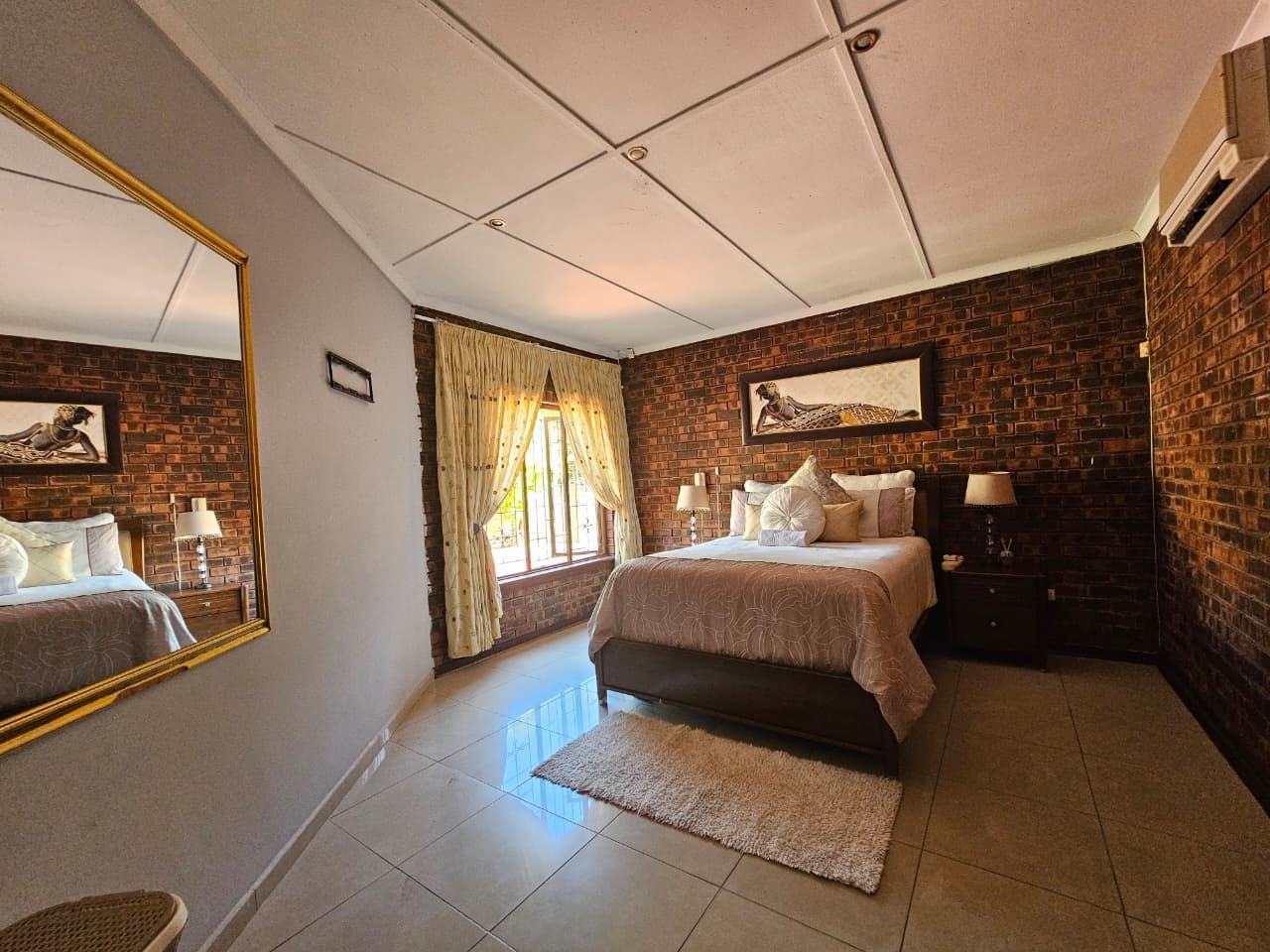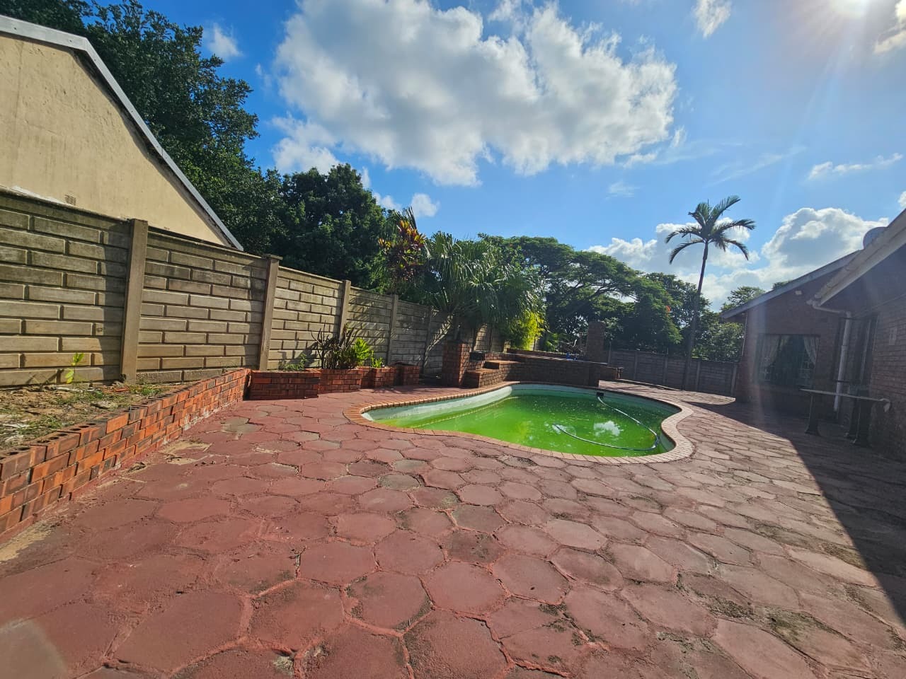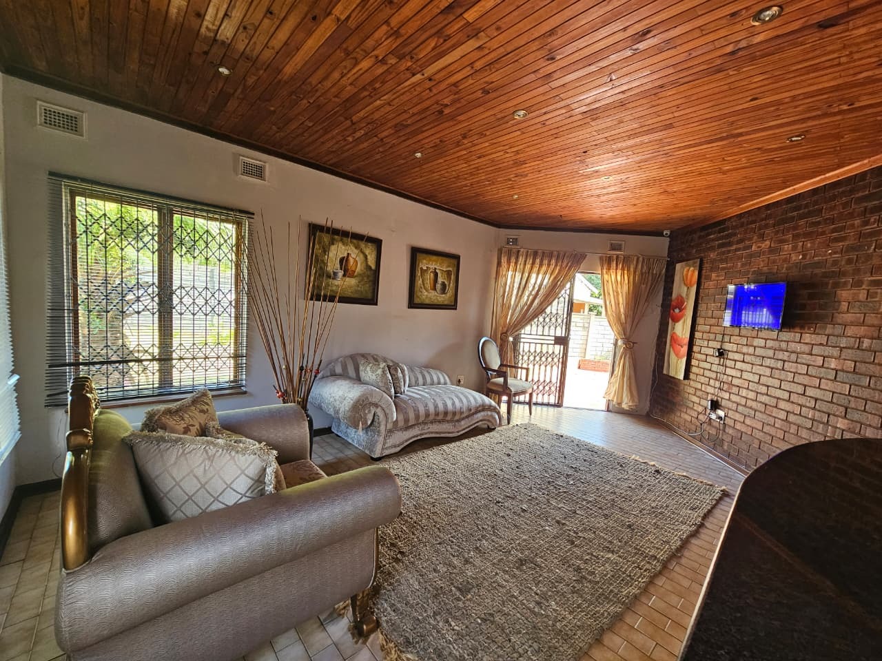 This inviting 3-bedroom, 1.5-bathroom rental property in Veld En Vlei, Richards Bay, offers comfortable living. The interior features a spacious lounge, dining room, and a well-appointed kitchen with ample counter space. Distinctive wood-paneled ceilings, exposed brick accent walls, and tiled flooring create a warm aesthetic, complemented by air conditioning and a built-in bar area.